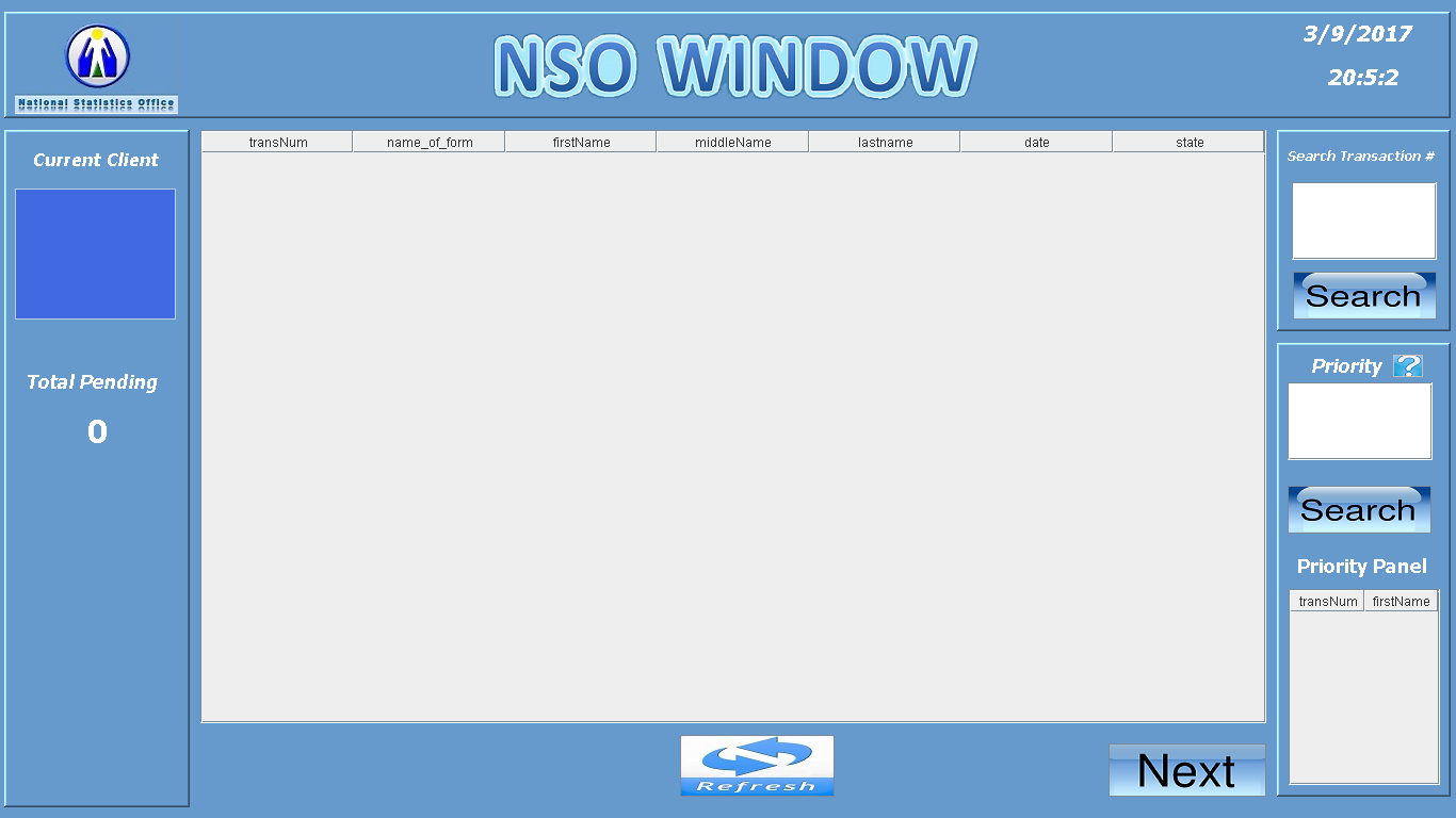 This is the view for the Employee in NSO department where they see the total number of pending transaction, what number is next, the details of the current customes and also they can search again the customers and so on.
