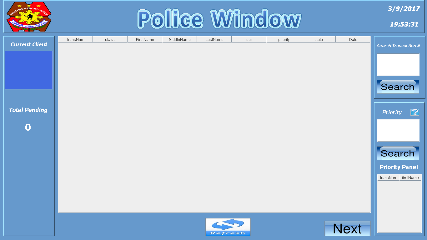 This is the view for the employee in Police Clearance Department where they see the total number of pending transaction, what number is next, the details of the current customes and also they can search again the customers and so on.